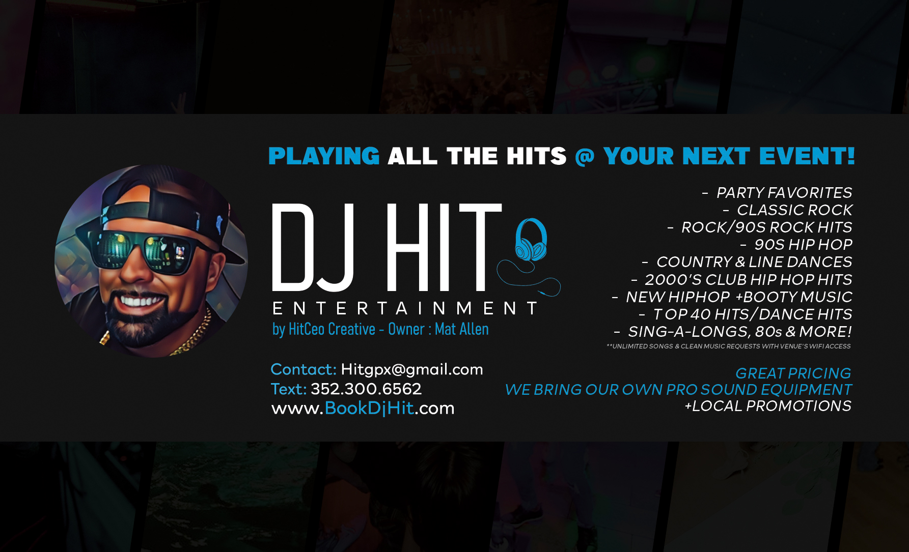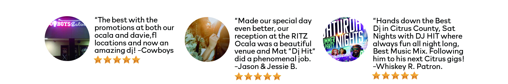 "PLAYING ALL THE HITS @ YOUR NEXT EVENT" - MOBILE DJ SERVICES IN CITRUS, MARION, HERNANDO AND SURROUNDING AREAS - Booking Inquiry: Your name Your email Event Type Your message (Event Type Details, Location, Date, Type of Crowd) Human Check - Answer This: 10+5-2=?